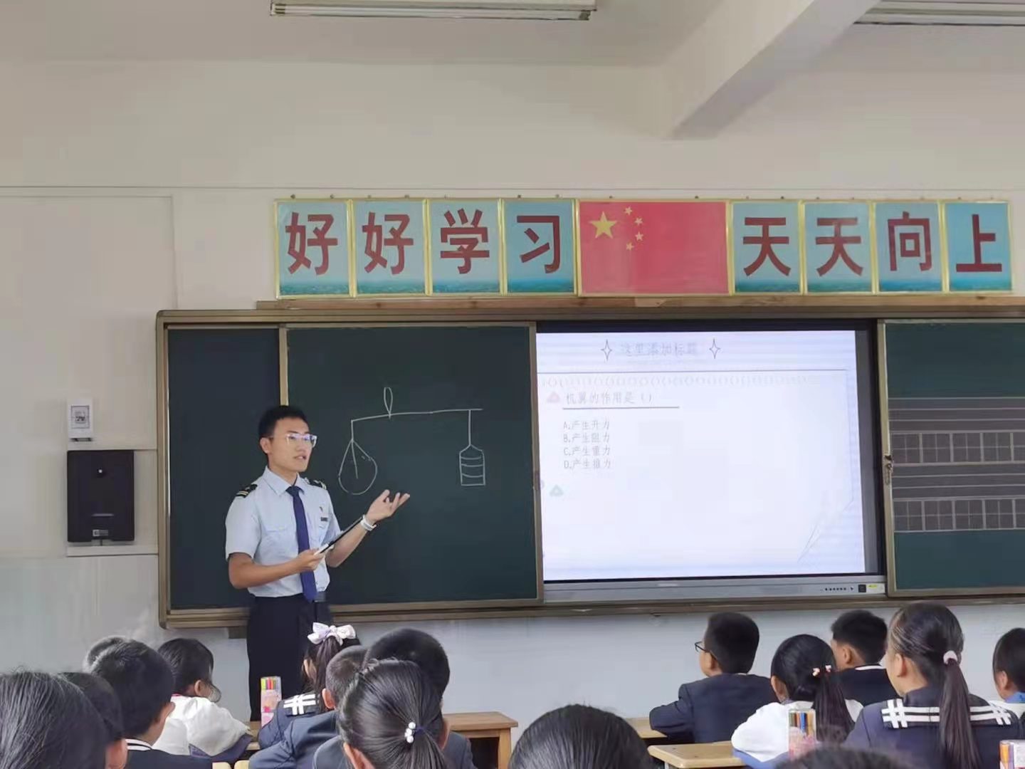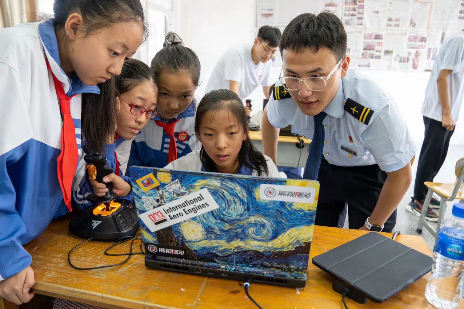 活动中,实践活动队员结合所学专业知识,为孩子们上一堂别开生面的“航空知识课”,普及航空知识,种下蓝天梦的种子。孩子们通过模拟飞行摇杆设备,过一把“开飞机”的瘾。队员与孩子们合作动手一起制作专属航模,在此起彼伏的欢呼声中,一架架亲手制作的航模陆续飞向蓝天。“我的梦想是成为飞行员”,通过简单、趣味的方式让小朋友们充分了解成为一名飞行员需要具备的身体条件,实践活动队员也切实感受到孩子们的天真可爱和对航空的好奇与渴望,鼓励孩子热爱运动、加强锻炼,长大后成为翱翔蓝天的雄鹰。带队教师还与孩子约定在美丽的大学校园相遇。
