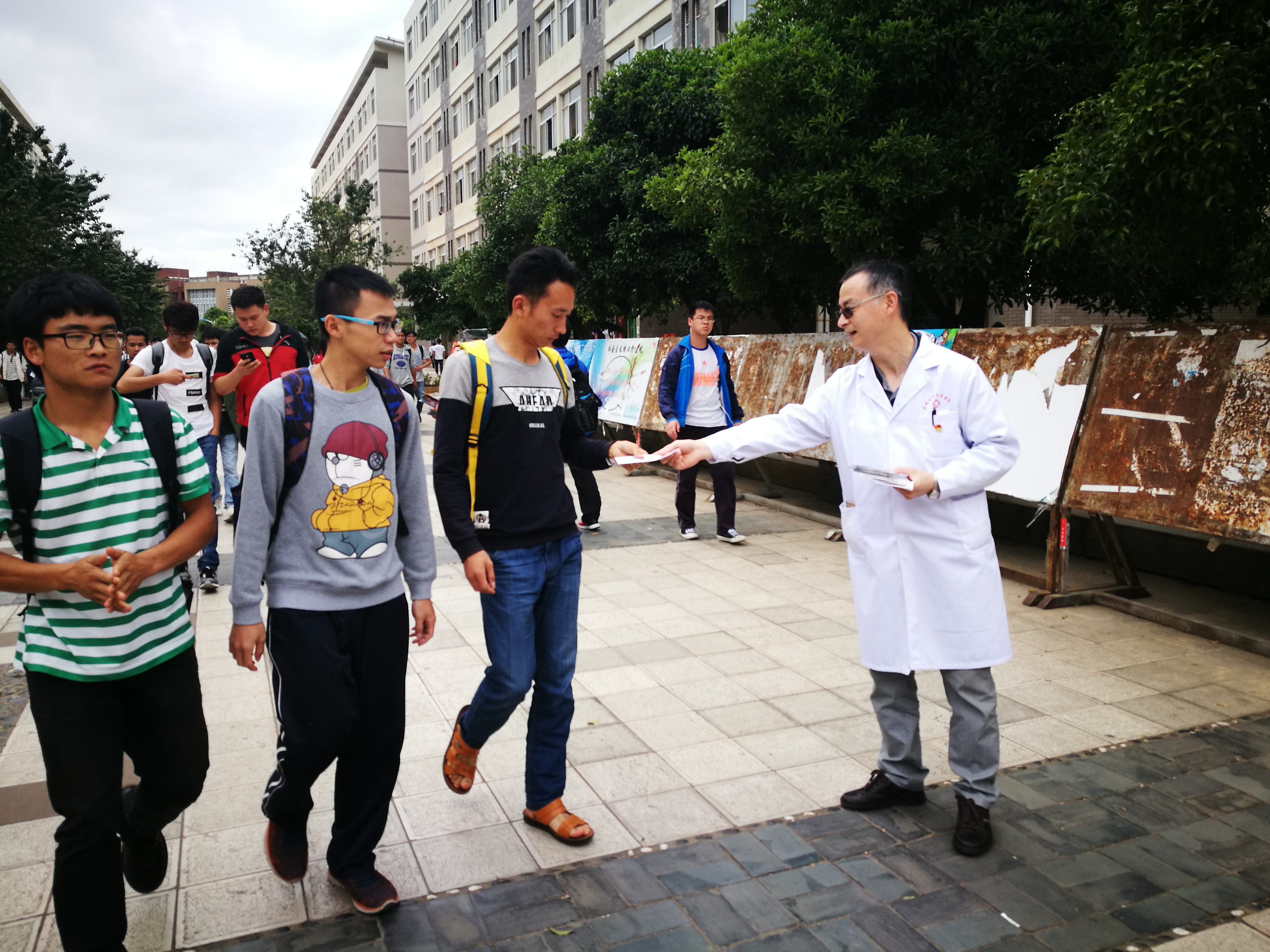 在怡园食堂门口,校医院的医务人员向过往师生发放传单,并在现场讲解吸烟引发的一系列健康、卫生和环保问题,通过宣传活动让广大师生进一步了解到吸烟的危害,提高大家对吸烟和被动吸烟危害性的认识,从而自觉主动地拒绝吸烟,营造控烟的良好氛围。医务人员还免费为师生们测量血压、身高体重,免费提供内外科、口腔科、理疗科和医疗保险等方面的咨询服务。