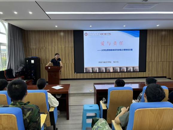 第一阶段朱书记围绕“爱与责任”这一主题开展大学生思想教育系列讲座。讲座开始书记向同学们强调了大学阶段学习的重要性,希望同学们在大学期间能够有规划目标并为之努力,珍惜这四年的黄金时间。关于“爱与责任”朱书记说到,希望同学们能够学会感受爱,付出爱,传递爱,能够多多关心家人朋友。希望同学们能够成为自律、自强、严肃、活泼、有理想、有激情、有品格、有爱心的年轻人。