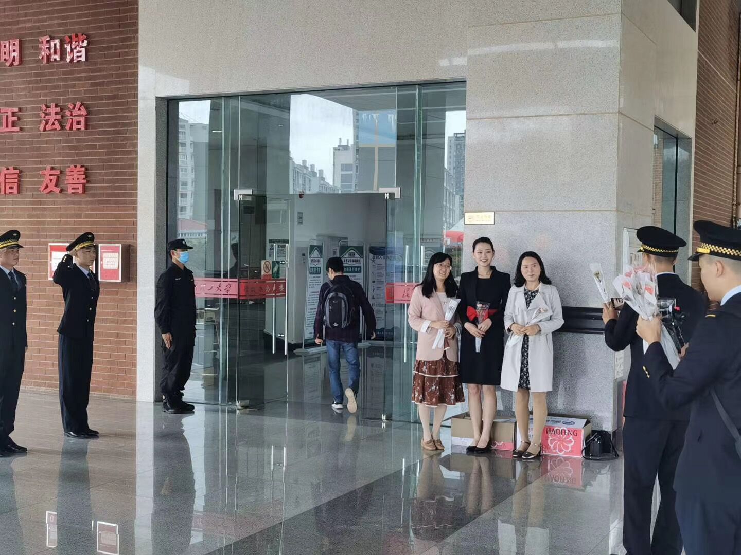 看到正装出现在楼下的学生们,老师们感到惊讶,收到鲜花和祝福语后都充满了欣慰,与现场学生合影留念,并细心询问同学们的学习情况与之后的工作发展方向,勉励同学们好好学习,牢记昆工精神,不怕吃苦、脚踏实地,努力学好专业知识,争做新时代的优秀大学生。在这样一个崇高的节日里,老师们与学生交流甚欢,现场气氛融洽,笑声不断。通过一束小小的花朵和一些简单的话语便大大拉近了老师与学生间的关系,加深了师生之间的感情。