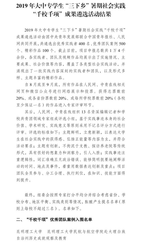 近日,由团中央青年发展部联合中国青年报社、人民网共同展开的全国2019年大中专学生“三下乡”暑期社会实践“千校千项”成果遴选活动结果正式公布,HEYZO 赴大理白族自治州“弘扬时代精神,奉献青春时光”暑期社会实践团队从众多参赛队伍中脱颖而出,入选“千校千项”优秀团队案例。