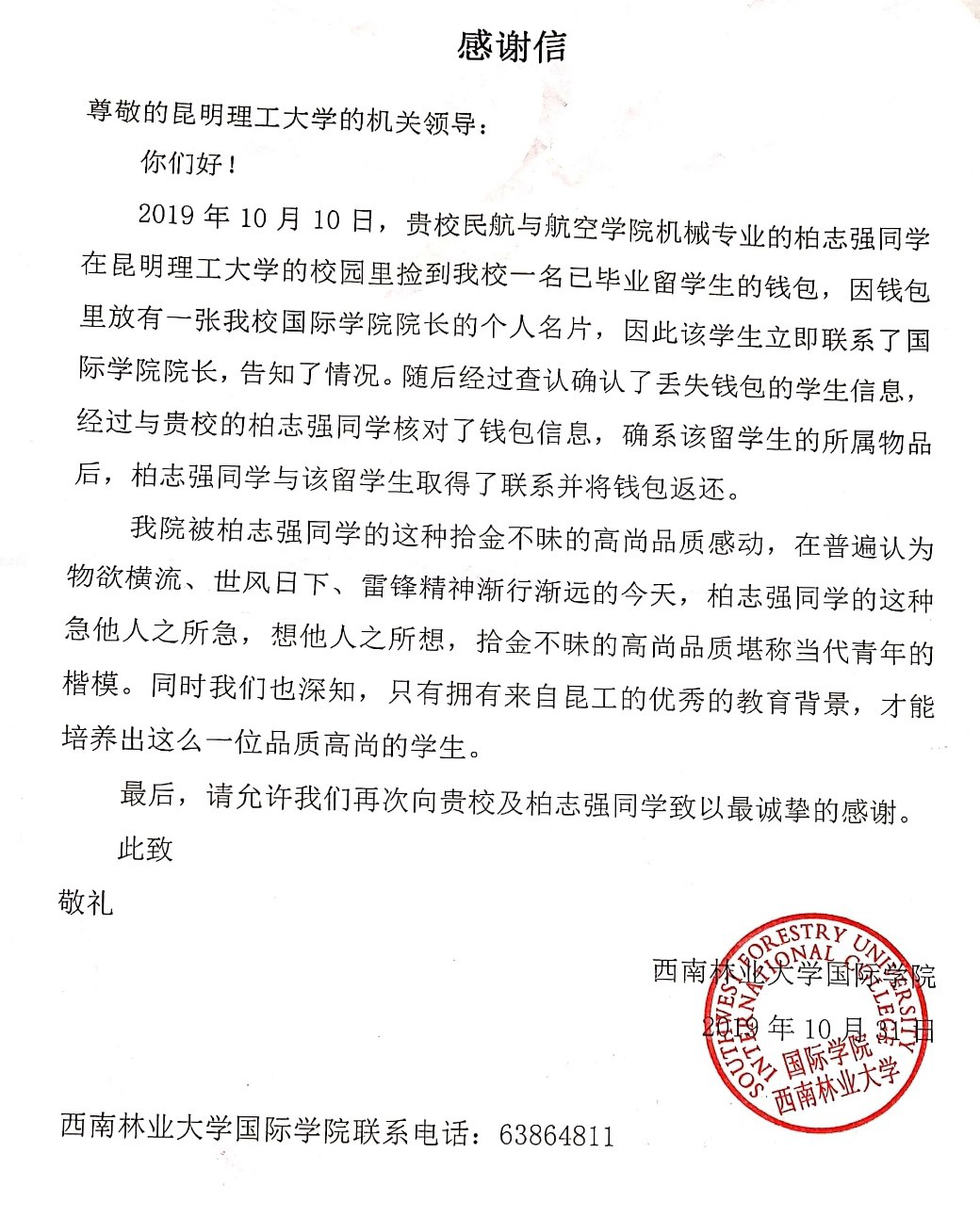 拾金不昧是中华民族的传统美德,是高尚道德情操的体现,也是党员践行初心使命的具体体现。近日,HEYZO 收到来自西南林业大学国际学院的一封《感谢信》,信中大力称赞2016级学生柏志强拾金不昧的高尚品质。