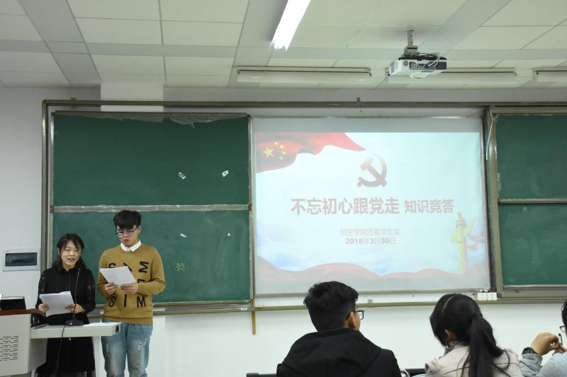 为响应团中央号召,以实际行动庆祝中国共产党第十九次全国代表大会的胜利召开,引导广大学生认真学习十九大精神,进一步激发学生爱国、爱党、爱社会主义的热情,促进学生健康成长,航空学院与3月30日晚在公教楼344举行“红色园区——不忘初心跟党走”主题知识竞赛。