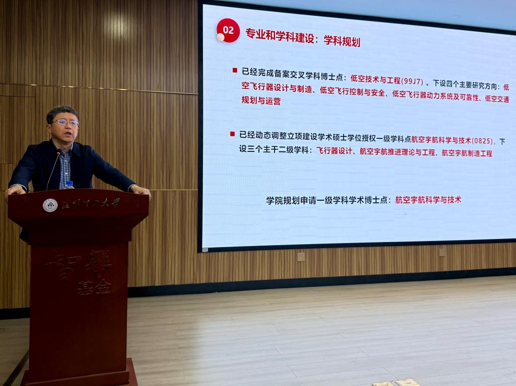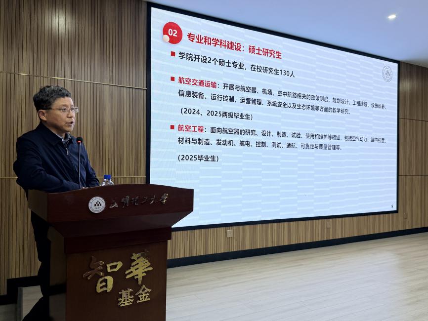 夏海廷院长从高层次人才培养的战略高度出发,系统介绍了学院研究生培养体系的建设进展。他表示,学院近年来持续推进本硕博贯通式人才培养布局,已形成覆盖飞行器控制与信息工程、交通运输、航空机械工程等本科专业,以及航空交通运输、航空工程等专业硕士点的完整培养链条,为学生深造提供了坚实支撑。