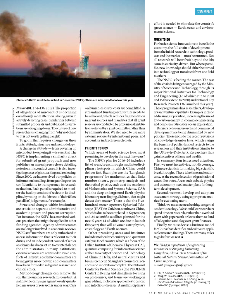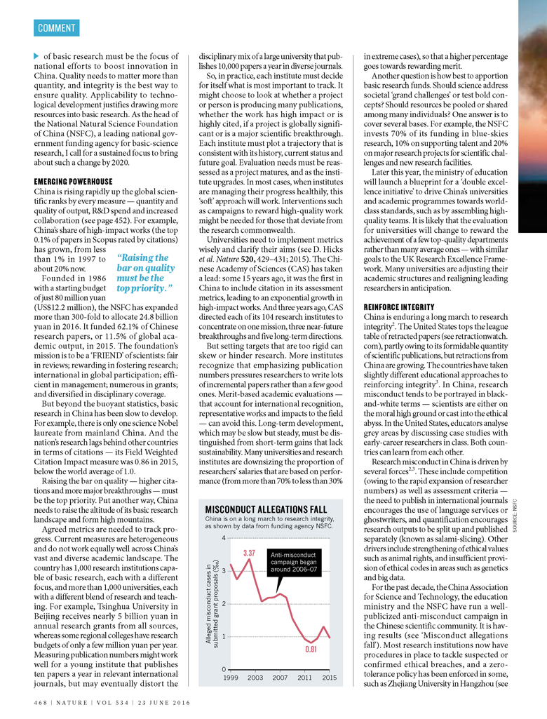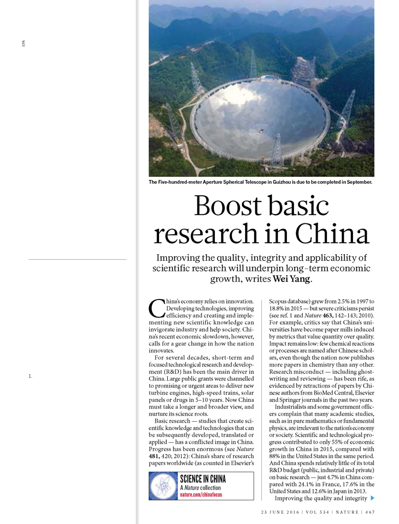 基础研究是指创造科学知识与新技术的研究,这些知识与技术随后能够得以开发、转化和应用。在中国,对基础研究众说纷纭。一方面,基础研究取得了巨大的进步(见Nature 481, 420; 2012)。据Elsevier的Scopus数据库的统计,中国在全球研究论文中所占份额从1997年的2.5%跃增至2015年的18.8%;另一方面,对基础研究现况也存在批评性意见(见引文1及Nature 463, 142-143; 2010)。例如,有评论指出,在重数量轻质量的评价体系诱导下,中国的大学已经沦为论文工厂。中国科学研究的影响力仍然较低,以中国目前发表论文数领先于各国的化学领域为例,鲜有以中国学者名字命名的化学反应或工艺过程。另外,BioMed Central、Elsevier和Springer旗下的一些期刊在过去两年撤销了中国大陆学者的一批论文,这表明科研不端行为(包括代写论文和虚假评审)在中国依然多发。