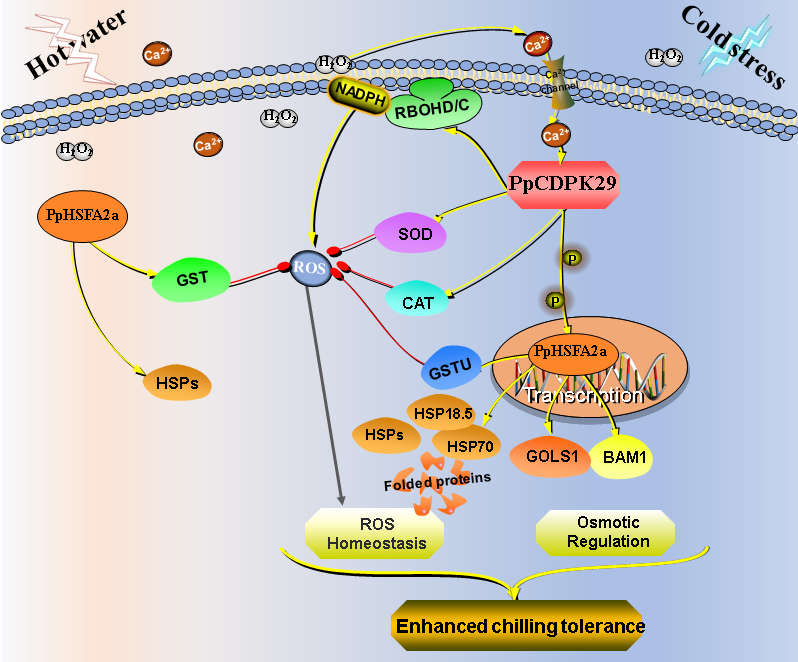 钙依赖蛋白激酶(CDPKs)是Ca2+和ROS信号传导的交叉点,CDPKs通过磷酸化RBOHs,在Ca2+-ROS信号通路中起核心作用。本研究筛选到一个对CaCl2和热处理响应最强烈的PpCDPK29,反向遗传学研究发现其可以正调控果实的采后抗冷性。进一步探究其作用的分子机理,发现热处理激活的PpCDPK29感知Ca2+信号后,通过与RBOHC/D互作诱导ROS产生,形成Ca2+-ROS信号通路,传递低温信号;PpCDPK29也可以与SOD和CAT互作激活抗氧化系统,清除过量ROS,从而维持贮藏期间ROS的稳态平衡。同时,PpCDPK2可以磷酸化PpHSFA2a,磷酸化后的PpHSFA2a发生核转移,增强对下游靶基因(PpHSP18.5、PpHSP70、PpGSTU7、PpGSTU19、PpGolS1和PpBAM1)的转录调控,这些靶基因进而作为分子伴侣保护蛋白、提高果实抗氧化能力以及增强渗透调节物质等来减轻桃果实采后冷害的发生。