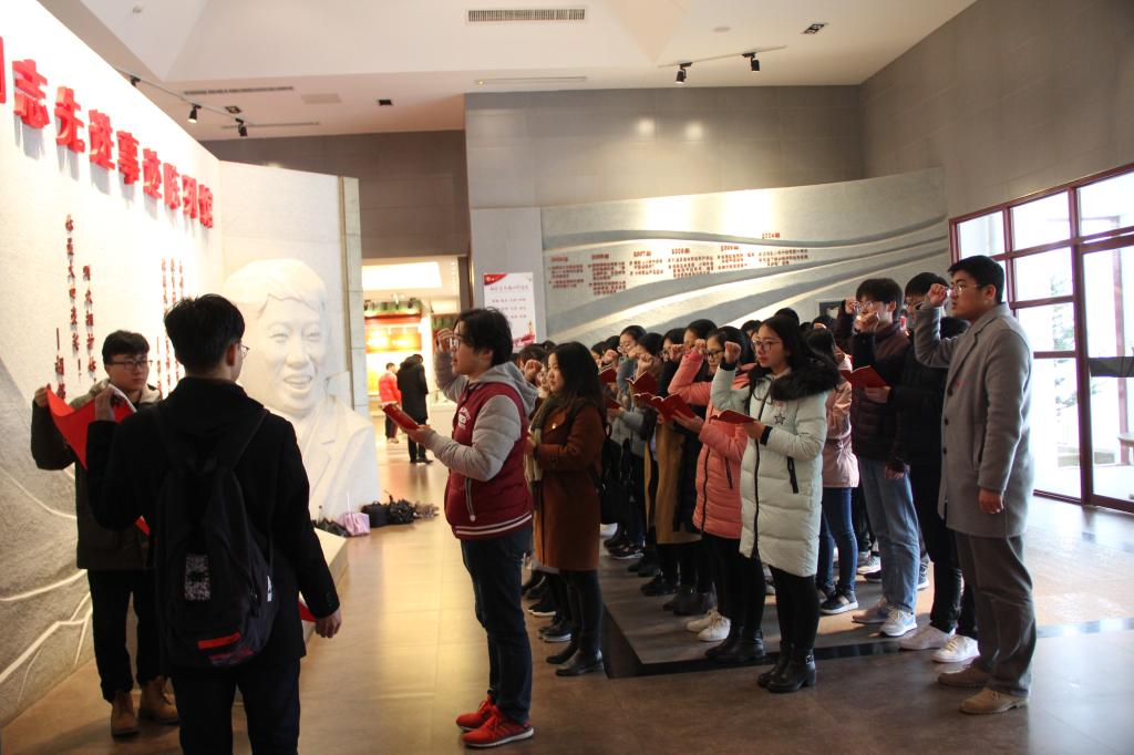 在沈浩同志先进事迹陈列馆,同学们通过参观沈浩生前工作地点,结合沈浩生前照片和遗物,感受到一名优秀的共产党员对党、对国家、对人民“鞠躬尽瘁死而后已”的精神,大家纷纷表示,要学习沈浩同志无私奉献、恪尽职守的品质。在陈列馆前,37位学生党员佩戴党徽,面向党旗,庄严宣誓,重温了对党的庄严承诺。