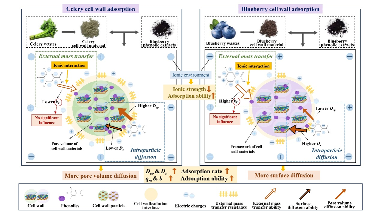 基于植物细胞壁与可溶性多酚间的非共价互作关系,本团队提出通过调控植物细胞壁与可溶性多酚间的互作行为,从而实现植物多酚的绿色分离。本研究首先对比了多种果蔬细胞壁组分吸附多酚的能力,发现芹菜和蓝莓细胞壁组分具有较强的吸附能力;进一步探究了不同环境离子强度下芹菜和蓝莓细胞壁组分与多酚互作的理化特性,并基于多孔扩散理论数值仿真了芹菜和蓝莓细胞壁吸附/解离多酚的物理过程;最后系统比较了植物细胞壁吸附/解离与传统大孔树脂吸附/解离技术在分离多酚方面的优劣。